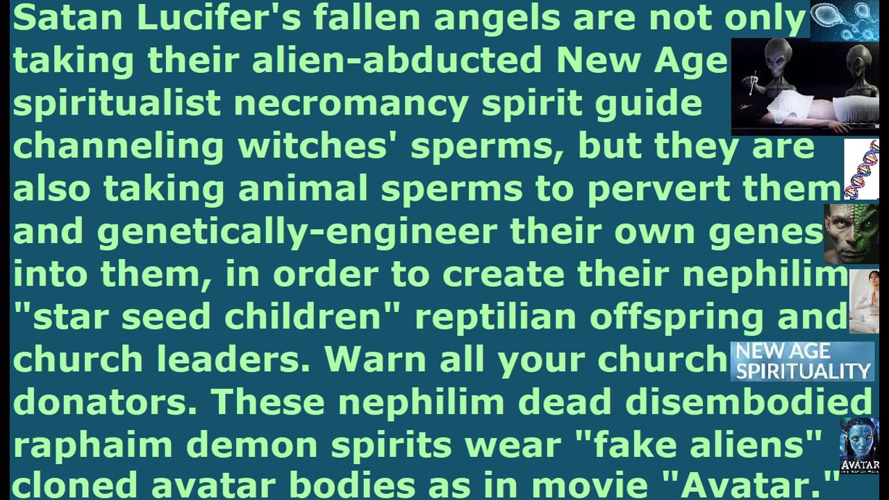 *** Intelligence news update from the Human Homo-Sapiens Race Survival Resistance (HRSR) headquarters and Republic Rebel Alliance battlefront (April 2025). Satan Lucifer's fallen angels are not only taking their alien-abducted New Age spiritualist necromancy spirit guide channeling witches' sperms, but they are also taking animal sperms to pervert them and genetically-engineer their own genes into them, and inseminating them into their New Age spiritualist witches as surrogate mothers, in order to create their nephilim "star seed children" reptilian offspring and Satanist church leaders and church staffs. These nephilim dead disembodied raphaim demon spirits, who died in Noah’s judgment flood, wear "fake aliens" cloned avatar bodies as in their movie "Avatar." Warn all your church donators and your 6 billion human specie neighbors as God’s “watchmen on the wall.” These millions of Western feminist nations’ “Bible verses redefining, uncovered women's heads rebels, fallen angel head controlled, men’s pants cross-dressers androgynous transgender” fake Christians and millions of Nicolaitan clergy class laity class Satanist pagan religious system's "ordained & allowed & trained & non-assassination-attempts-receiving" fake unbiblical job position pastors absolutely hate speaking the tens of thousands of truths we real Christians shared to them, because they are afraid of getting cooked alive by CIA microwave oven weapons from next door homes & every hotel room every day, and getting shot with FBI pinpoint heart attack EMF weapons from next door homes & every hotel room, and getting poisoned by NSA sulfuric acid & polonium radiation & mercury & flesh-eating bacteria HIV biochemical weapons, and facing starvation & homelessness risks many times with only a few dollars left in their wallets, and having demon spirits sent to attack them all day long who rip in two their own Satanist Catholic exorcist priests, and having their heathen families either slaughtered or their brains controlled to try to kill them, and receiving witchcraft & psychic attacks to try to explode their hearts, and having CIA NSA MI6 FBI Freemason Jesuit Wicca Black Ops Satanist assassins trying to shoot them in the head in their apartment lobbies, and having their urethras and anuses and clitorises molested all day long by demons, and having tens of thousands of gang-stalkers shooting them with mobile phone EMP shock weapons in every room & toilet & shower & workplace & classroom & shop & restaurant & beach & park & forest every few minutes in the heart & brain & liver & genital & eyes & kidneys, and being microwaved by F-15 jets and drones and boats and dozens of CIA tinted-window white trucks all day, and having Satanists time traveling back into their childhood to try to kill them hundreds of times even before they are born, and hundreds of other persecutions. They are fake "Bible's watchmen on the wall." Even worse, they even have the audacity to bring greater judgment upon themselves by insulting God by trying to appease both Satan Lucifer & God by modifying & diluting & sterilizing & picking & choosing & editing the tens of thousands of truths we real Christians shared to them in our daily sermons for decades, in order to make it safe for themselves from assassination attempts and ridicule from church donators, so that they can sabotage God’s truths and destroy our real Christians’ ministries and cover-up Satan Lucifer and mislead millions of people to hell & false realities & false understandings & false complacencies & false political/social solutions.