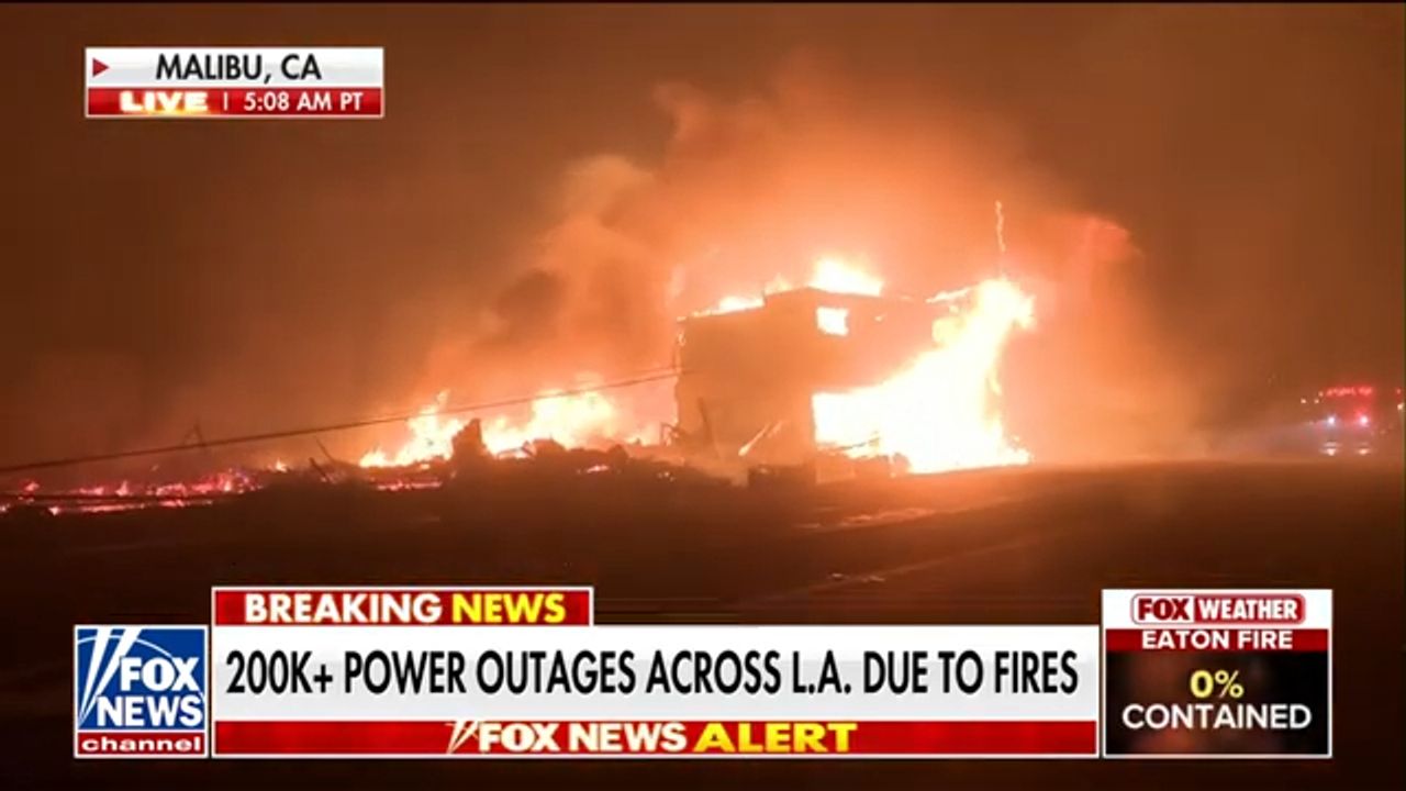 WATCH: Power line falls as strong winds fuel LA fires, engulfing homes