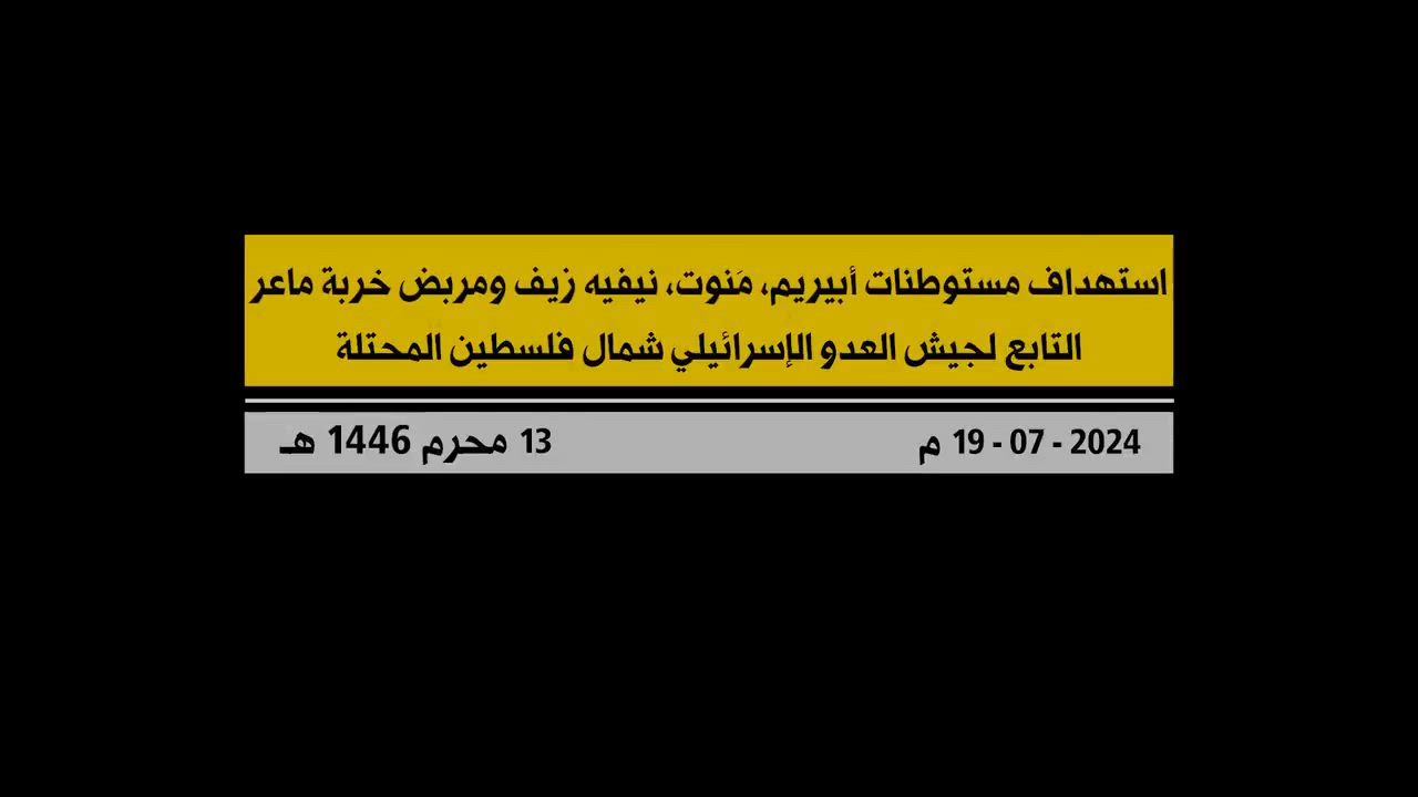 Scenes from the operation of the Islamic Resistance targeting settlements of Abirim, Menot, Neve Ziv, and the Khirbet Maar camp of the Israeli enemy army in northern occupied Palestine.