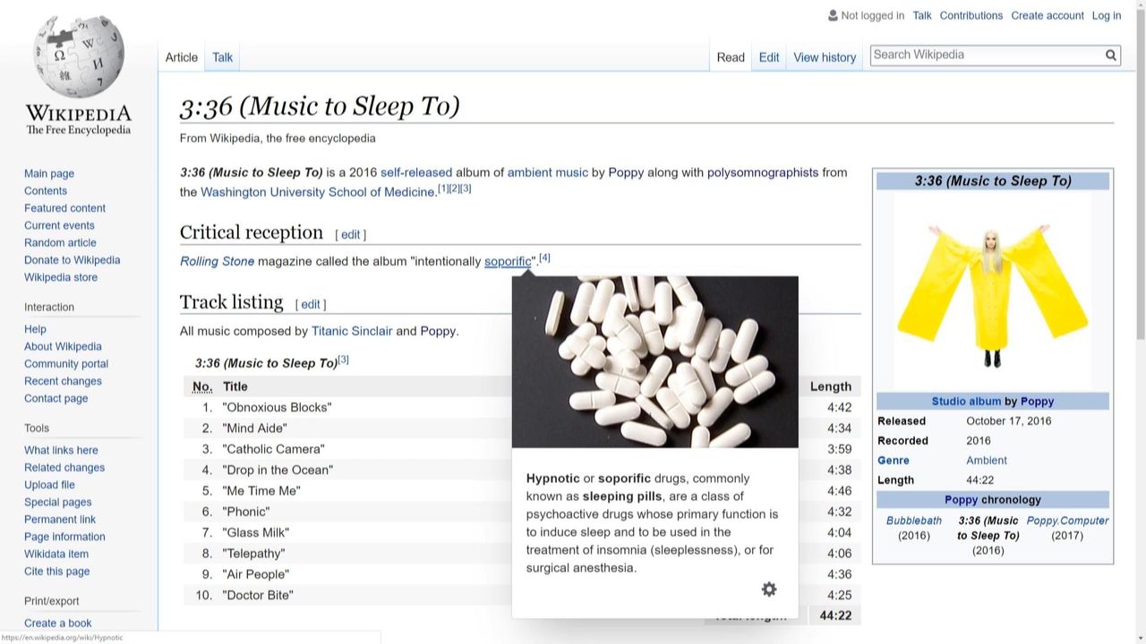 Poppy's 3:36 (Music to Sleep To) is a 2016 self-released album of ambient music, produced with polysomnographists from the Washington University School of Medicine. Rolling Stone magazine called the album "intentionally soporific" - and such is the way of the opium poppy.