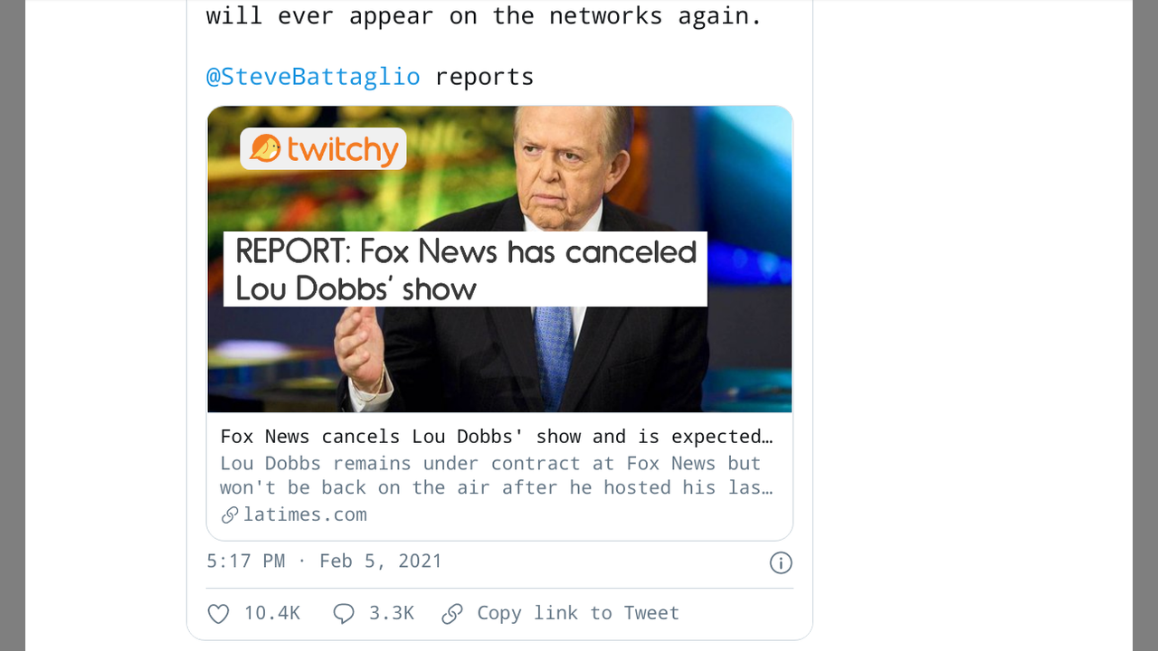 https://twitchy.com/gregp-3534/2021/02/05/report-fox-news-has-canceled-lou-dobbs-show/