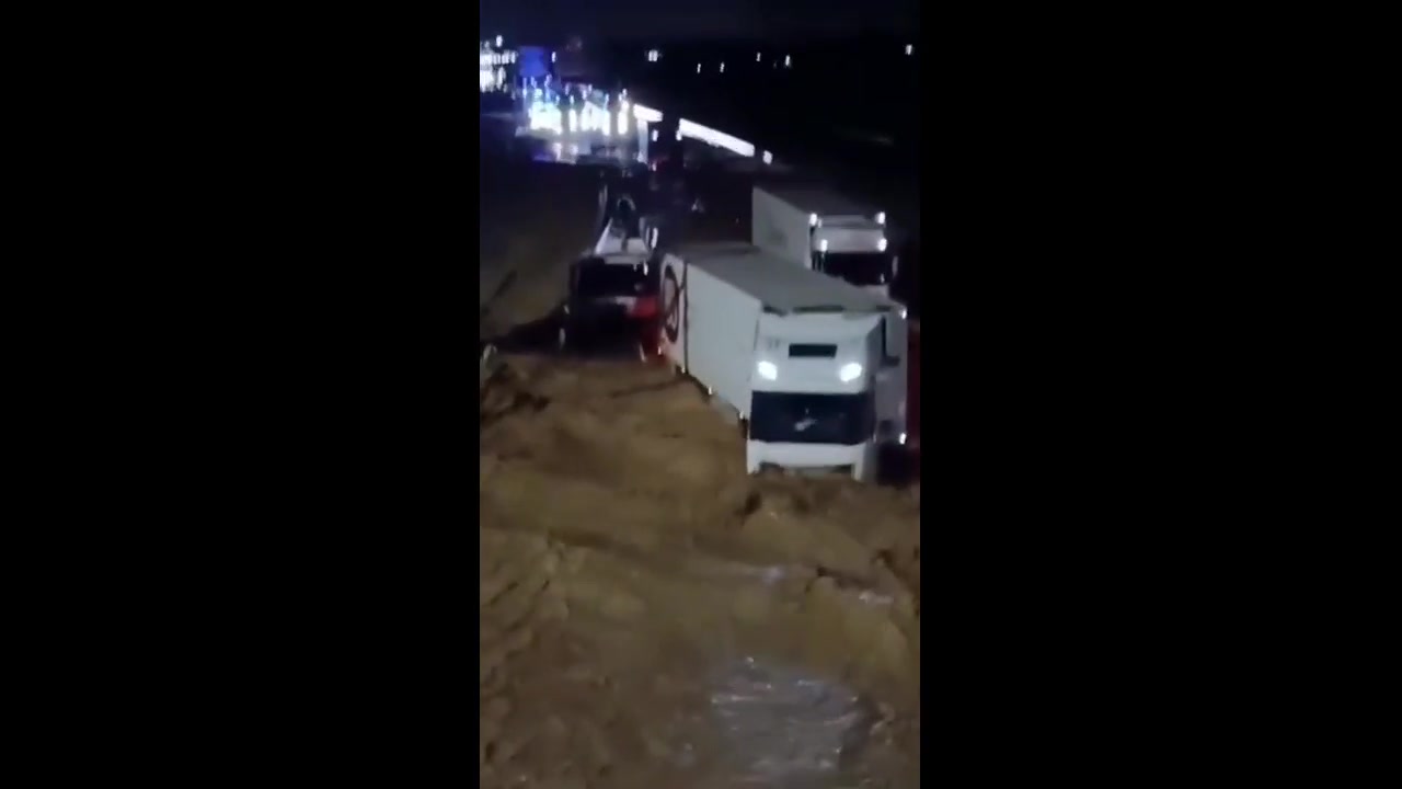A man desperate holds on to the roof of his car struggling against the river on the highway.