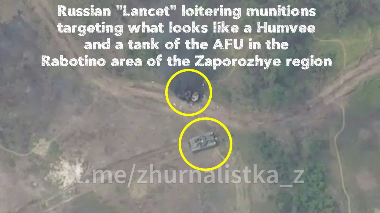 Russian troops using "Lancet" loitering munitions targeting what looks like a Humvee and a tank of the NATO Proxy Force (NPF) in the Rabotino area of the Zaporozhye region.