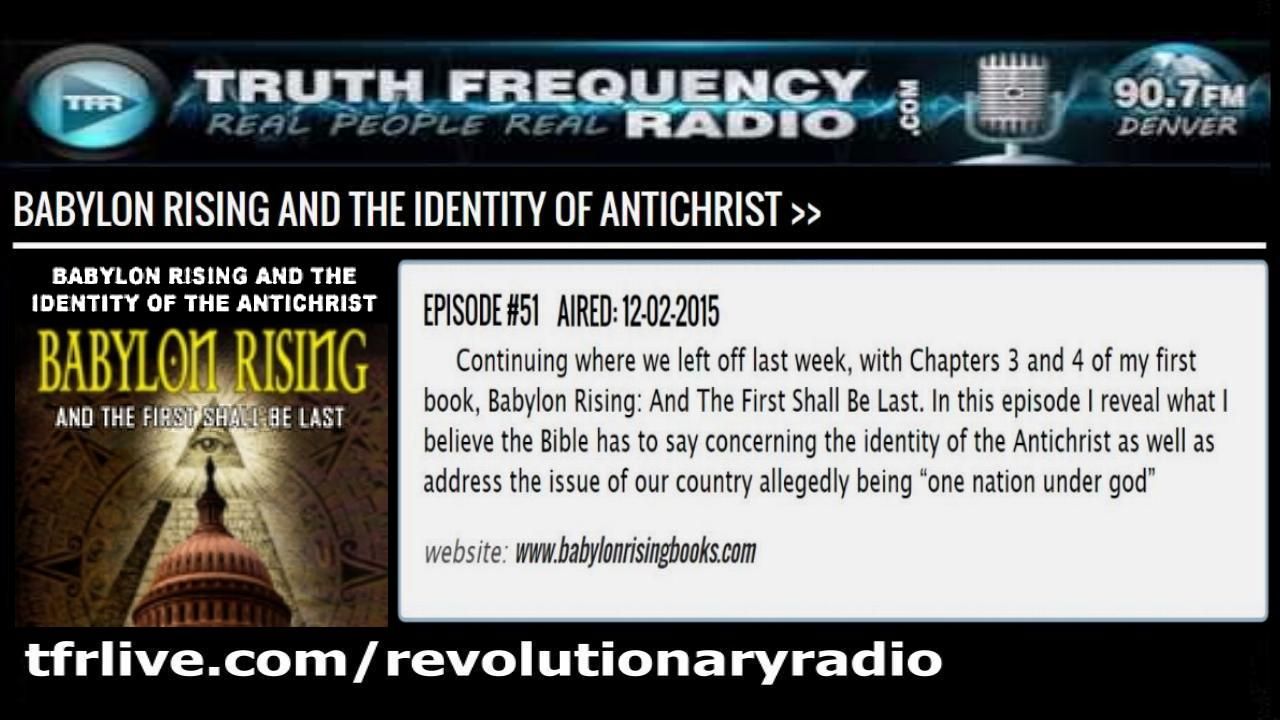 Continuing where we left off last week, with Chapters 3 and 4 of my first book, Babylon Rising: And The First Shall Be Last. In this episode I reveal what I believe the Bible has to say concerning the identity of the Antichrist as well as address the issue of our country allegedly being “one nation under god”