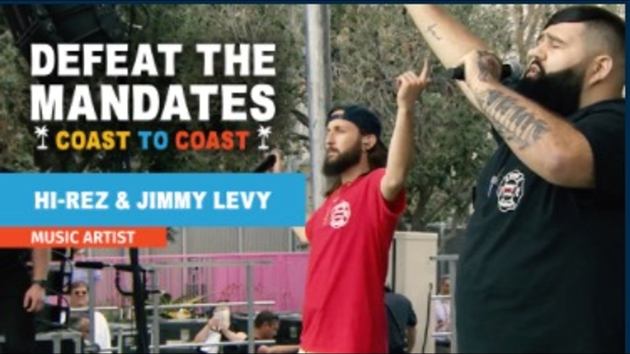 High-Rez & Jimmy Levy perform in front of thousands of attendees at the ‘Defeat The Mandates’ Rally held at Grand Park in Los Angeles, CA, on April 10th.