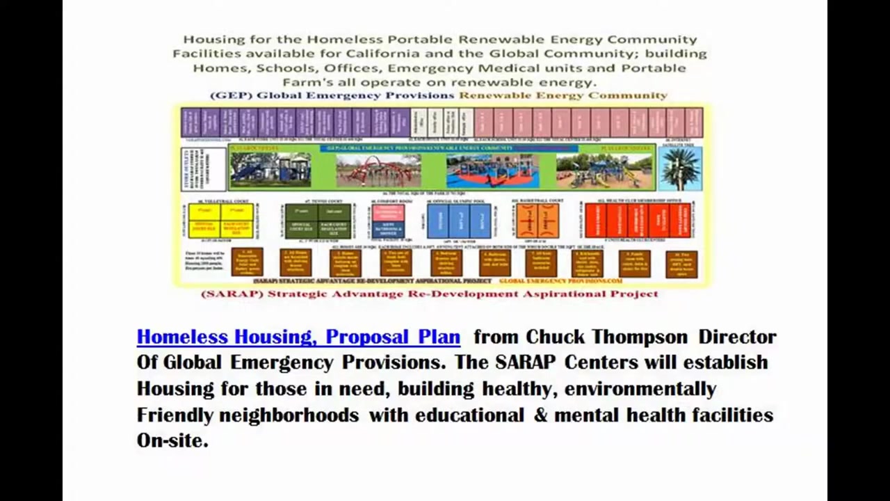 Homeless Housing, Proposal Plan from Chuck Thompson Director of Global Emergency Provisions. The SARAP Centers will establish Housing for those in need, building healthy, environmentally friendly neighborhoods with educational & mental health facilities on-site. 626 243 8200 [email protected]