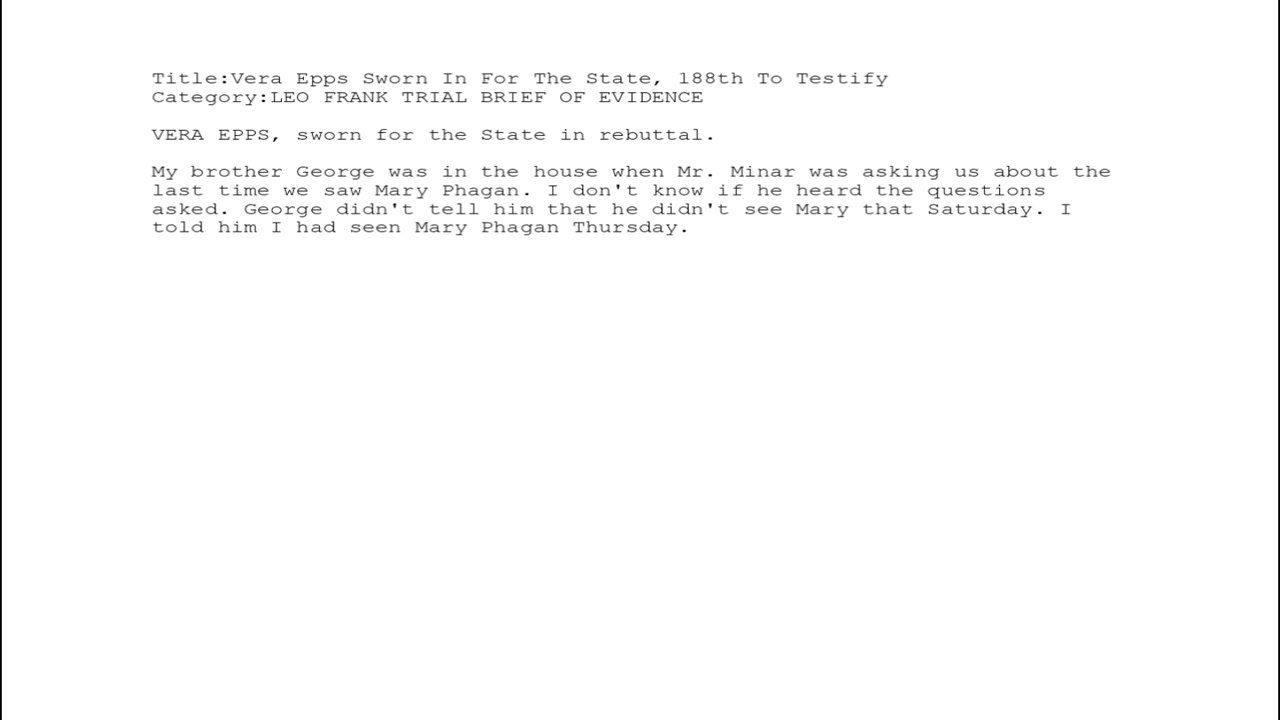 VERA EPPS, sworn for the State in rebuttal at the Trial of Leo Frank in the Fulton County Superior Court of Atlanta Georgia in August 1913 (Testimony Portion From July 28 - August 21, 1913; Closing Arguments August 21-25, 1913)