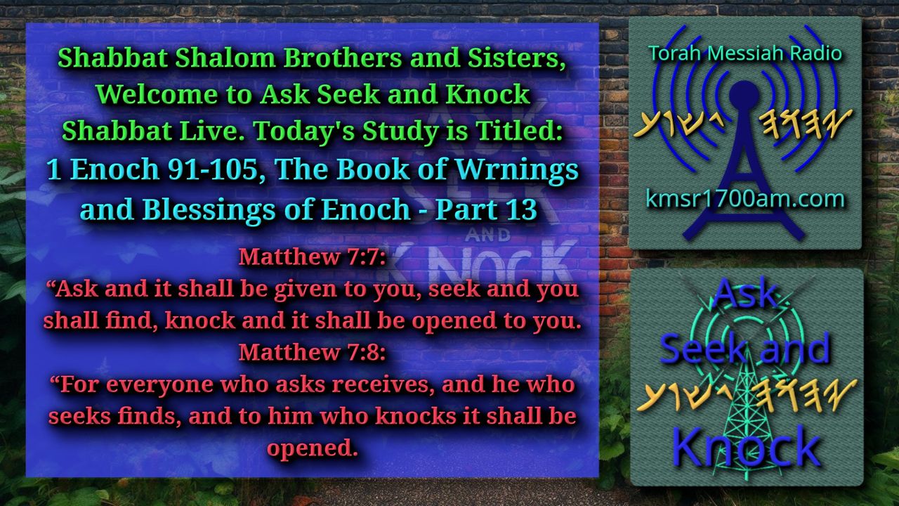Thank you for Joining us with kmsr1700am.com for another addition of Ask Seek and Knock Shabbat Live Study. Today we discuss “1 Enoch 91-105, The Book of Warnings and Blessings of Enoch Part 13”. Please remember to test everything to the Scripture and thank you for watching.