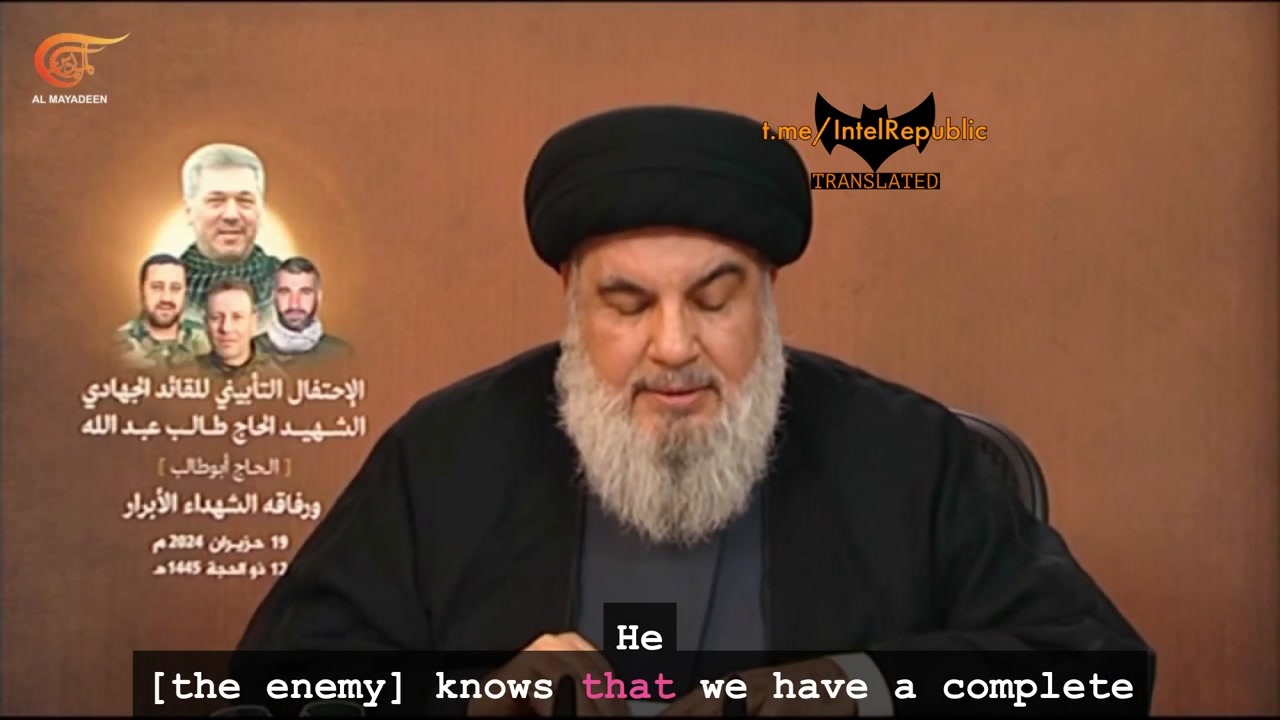 Hezbollah SG Sayyed Nasrallah issues firm warning to Israel to anticipate attacks on all ends from land, sea, and air from Lebanese resistance group adding that next level of attacks will have no red lines.We have a complete and real target bank and ability to reach all goals, shake foundations of [Israel] entity. The enemy knows that what also awaits him in Mediterranean is very great - Nasrallah.Hezbollah SG Sayyed NasrallahSecretary General of Hezbollah
