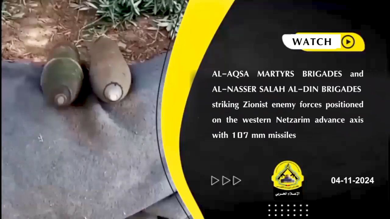 Al-Aqsa Martyrs Brigades (Fatah) and Al-Nasser Salah Al-Din Brigades (PRC) striking Zionist enemy forces positioned on the western Netzarim advance axis with 107 mm missiles