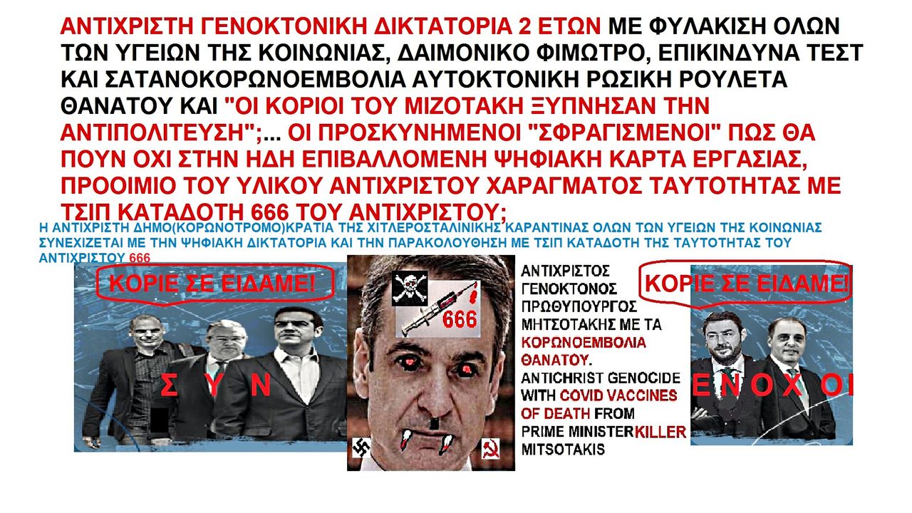 ΑΝΤΙΧΡΙΣΤΗ ΨΥΧΟΚΤΟΝΙΚΗ ΔΙΚΤΑΤΟΡΙΑ 2 ΕΤΩΝ ΤΟΥ ΤΡΟΜΟΚΟΡΩΝΑΙΟΥ ΚΑΙ ΞΑΦΝΙΚΑ ΞΥΠΝΗΣΕ Η ΣΥΝΕΝΟΧΗ ΑΝΤΙΠΟΛΙΤΕΥΣΗ ΑΠΟ ΤΟΥΣ ΚΟΡΙΟΥΣ ΤΟΥ ΜΙΖΟΤΑΚΗ! https://ugetube.com/watch/vXKopNI5LeAPKGC , https://rumble.com/v1h7jrv-mitsotakis-is-a-dictatorial-bug-of-the-antichrist-666.html . ΠΗΓΕΣ: http://www.freevolition.gr , https://youtu.be/okiZJii-M60 , https://rumble.com/v1gsfx9-20081947-20082022-75-.html , https://amazonios.net/g-payloy-tha-arrostisoyn-me-karkinoys-ta-paidia-mas-einai-viologiko-oplo-kai-synomosia , https://www.facebook.com/fonirodopis.gr/videos/596502135059887 , https://youtu.be/AwQ8nIFvoDM .