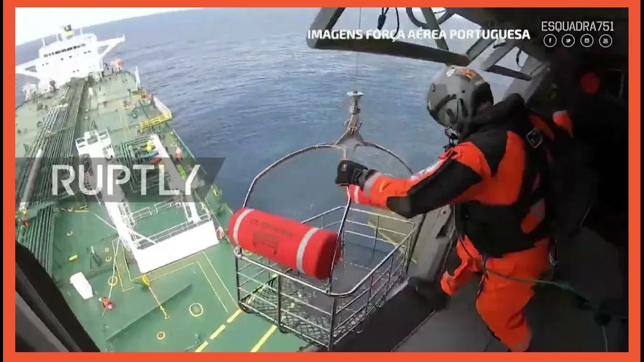 Footage shows the Portuguese Air Force rescuing the crew of the burning Felicity Ace.