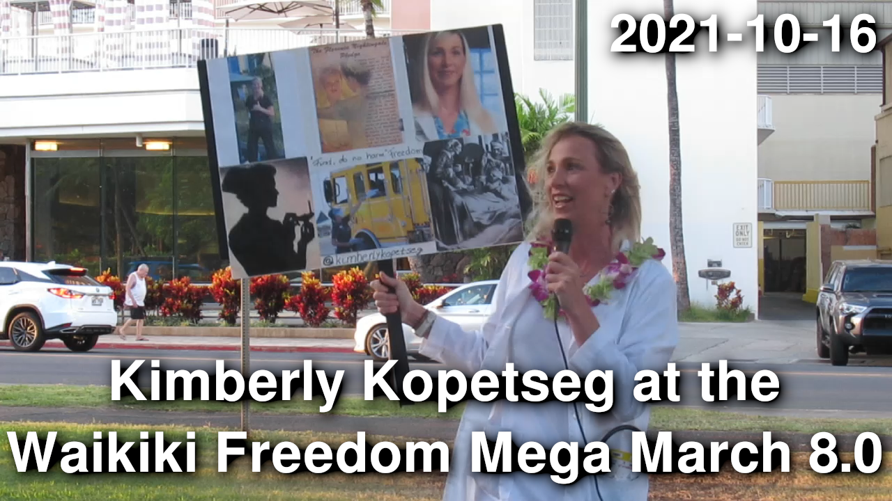 On October 16, 2021, just before people marched down Kalakaua Avenue in Waikiki, nurse Kimberly Kopetseg shared her testimony. Kimberly Kopetseg is a nurse of twenty one years performing neurosurgery on the brain and spine. She shared how the experimental injections contain messenger RNA that will manipulate our genetic code. Communism is here and it's moving fast.