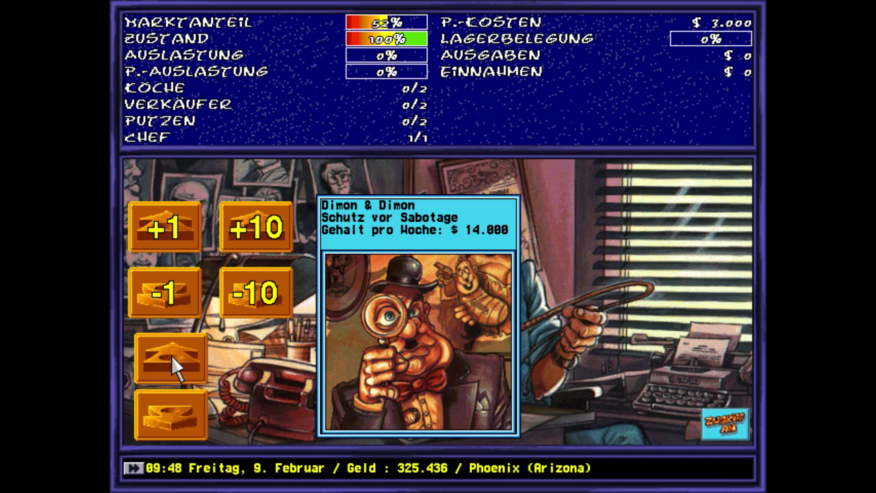 American Dream is a typical German economical simulation in the vein of Mad TV or Pizza Connection. You have a number of static screens where you click on different objects to access menus. You order various kind of fastfood and softdrinks for your restaurant, place ads, hire staff, set prices and renovate, extend and build restaurants. You can buy insurances against accidents, sabotage and things like food poisonings (food you buy has an expiration date). At the beginning of the game, you choose a rival to play against. You can hire people to sabotage your opponents restaurants and vice versa. Restaurants can be protected by hiring private investigators, who will also look after the quality of your food and the state of the restaurant. Once you have become responsible for the whole US, you can hire managers to take care of restaurants in order to cut down the micro-management. Then you can also develop new products in a lab.
