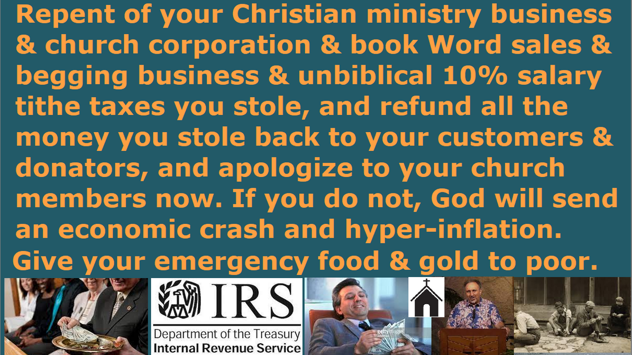 Repent of your Christian ministry businesses and church corporations, and selling of Christian books and God’s Word and God’s truths, and taxing unbiblical 10% salary tithe taxes. Refund all your Christian ministry donations that you got from begging, and all the unbiblical 10% salary tithe taxes you stole, and profits from selling all the products, and refund it to the customers, and give the rest to the poor. Give all your emergency gold and emergency food to the poor and widows and orphans now. If you do not, God will send an economic crash and hyperinflation upon you. Do it now! These are not nice religious spiritual concepts I am talking about, like the dumb brain-dead religious Christian freak hordes think we real Christians are preaching, but we are talking about specific actions you need to take now. Do it! Repent, repent, repent, and receive Jesus as Savior, and make straight the way of the Lord! End of transmission…