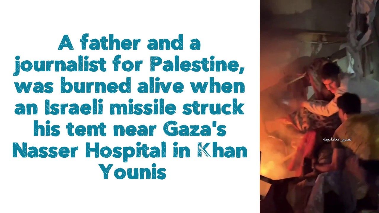 18+ A father and a journalist for Palestine, was burned alive when an Israeli missile struck his tent near Gaza's Nasser Hospital in Khan Younis.
