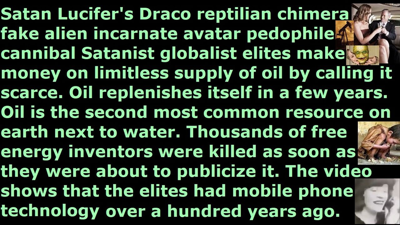 *** Intelligence news update from the Human Homo-Sapiens Race Survival Resistance (HRSR) headquarters and Republic Rebel Alliance battlefront (August 2024). Satan Lucifer's Draco reptilian chimera fake alien incarnate avatar pedophile cannibal Satanist globalist elites make money on limitless supply of oil by calling it scarce. Oil replenishes itself in a few years. Oil is the second most common resource on earth next to water. Thousands of free energy inventors were killed as soon as they were about to publicize it. The video shows that the elites had mobile phone technology over a hundred years ago. The Dracos have trillions of dollars while millions of humans in Africa and Southeast Asia are intentionally depopulation starved to death to feed on their soul energy. End of transmission…