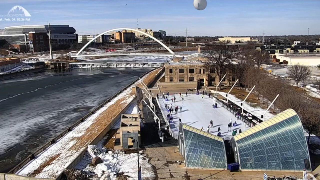 Chinese spy balloon was caught on the skyline cam in Des Moines IA above the outside city skating rink.