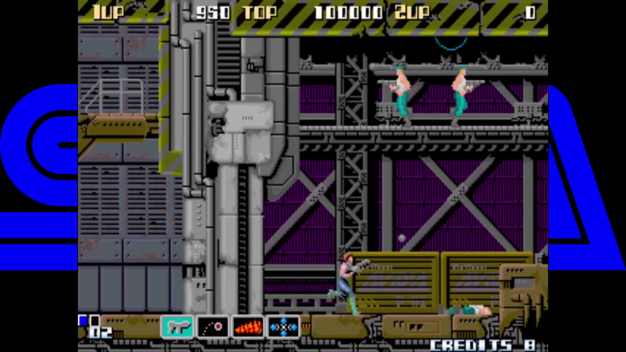 Bay-Route is similar to the Contra, but you have several hit points, you do not collect additional weapons. There are four different weapons, and they are always at your disposal. You can switch between weapons with a button. There is a standard shot, grenades (which have limited ammo), a flamethrower and shot with lower fire rate which explodes into four smaller shots when hitting anything. You can aim in all directions. Weapons can be upgrades by finding a power-up, though only the weapon currently active will be upgraded. If you die, you loose the upgrade of your current weapon. Other power-ups extend your life points or refill your health.
