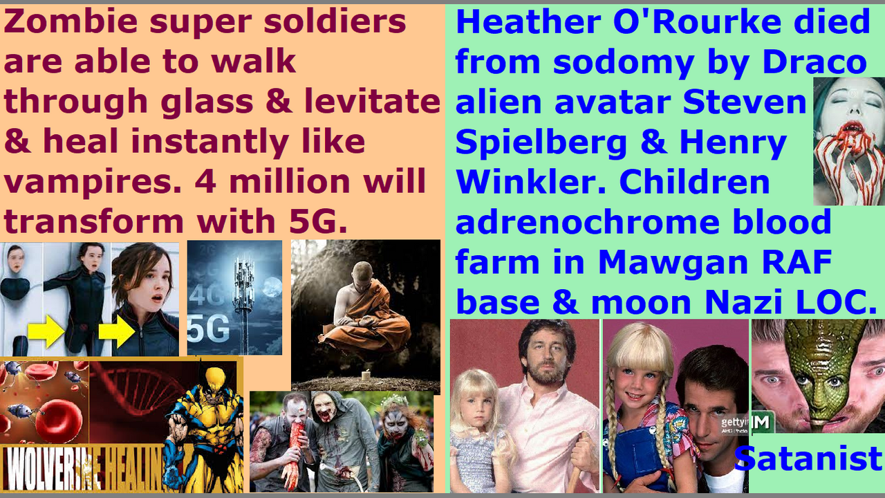 Their Illuminati Luciferian Satanism New Age Wicca witch doctrine of human ascension is to ascend humans into a COVID-19 Coronavirus vaccine AI femtobot nanite Borg hive-mind zombie T-Veronica virus neurolink 5G remote control transhumanism non-souled nephilim, just like they did in Noah’s Atlantis days. The pre-flood Noah’s days humans’ corpses excavated from the melted Antarctic ice are filled with biochemical weapon nanites. Satan Lucifer and the “gay mafia elite” fallen angel ascended master avatars are preparing to start their zombie apocalypse. Their CDC and Michigan State University are creating training videos and online courses for the zombie apocalypse. They are bringing FEMA and police and military together to train for the zombie outbreak. They already got permission from the End Times “women’s equality” “women’s head coverings rebelling” “fallen angel mind-controlled” apostate religious Christians and sinful wicked atheists who watch those zombie movies and play zombie video games, and who are silent and condone the Uroboros virus out of fear of being assassinated, and their families massacred, and place on the top of the list for the FEMA zombie virus, and get ridiculed by all their church donators and Christian book customers and bosses and coworkers and clients and friends as some kind of zombie movie fan delusional psychotic lunatic heretic idiotic narcotic maniac. Richard Bay, the CEO of Umbrella corporation, who uses the name Tom Cruise when he stars in Hollywood movies, is always seen on the moon Nazi SS LOC (U.S. Navy Lunar Operations Command) to pick up the adrenochrome children’s blood from the human children farm located there. Lt. Col. Michael Aquino, the Draco Prime royal bloodline reptilian chimera alien incarnate avatar, who is the hidden leader of the NSA and who runs the Hillary Clinton Foundation’s CIA global child-trafficking ring, operates the adrenochrome children’s blood farm from the St. Mawgan Royal Air Force base’s underground Draco Nazi 4th Reich base and the LOC. The Umbrella corporation also developed the Uroboros zombie virus and COVID-19 Coronavirus vaccine T-Veronica virus. They are trying to start a zombie apocalypse after we real Christian Church Saints “Bride of Christ” finish our warning and are raptured into heaven, and the Holy Spirit is gone from the earth. Heather O'Rourke was killed at 12 years of age by the Draco reptilian chimera alien incarnate avatar Steven Spielberg and Henry Winkler raping her. When the Draco avatars sodomize a child, the blood vessels in the anus ruptures, and the feces gets into the blood and poisons them and kills them. 90% of the Hollywood and music industry celebrities have been replaced by these demon spirit entities, and they are above the law and the police cannot touch them. This is why Donald Trump is trying to cause a nuclear war to exterminate the human homo-sapiens specie, but he does not arrest Oprah Winfrey or Hillary Clinton or Katy Perry or all the other New Age Satanist hybrid elite pedophile cannibal feminist Wicca witches.