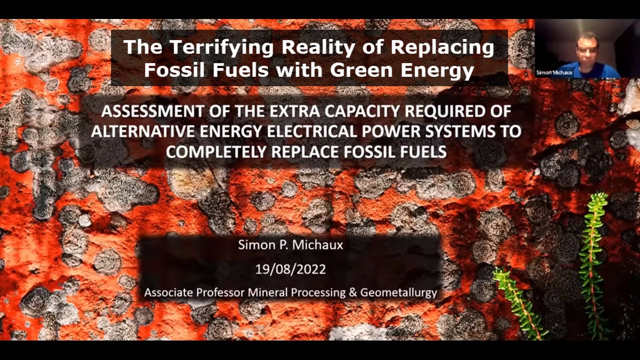The replacement of all fossil fuels with green energy is filled with unproven assumptions and ignored material realities. Professor Simon Michaux uses what he calls "blue chip data" or "their own data" to demonstrate the reality of what it means to replace our current fossil fuel energy model with green energy.