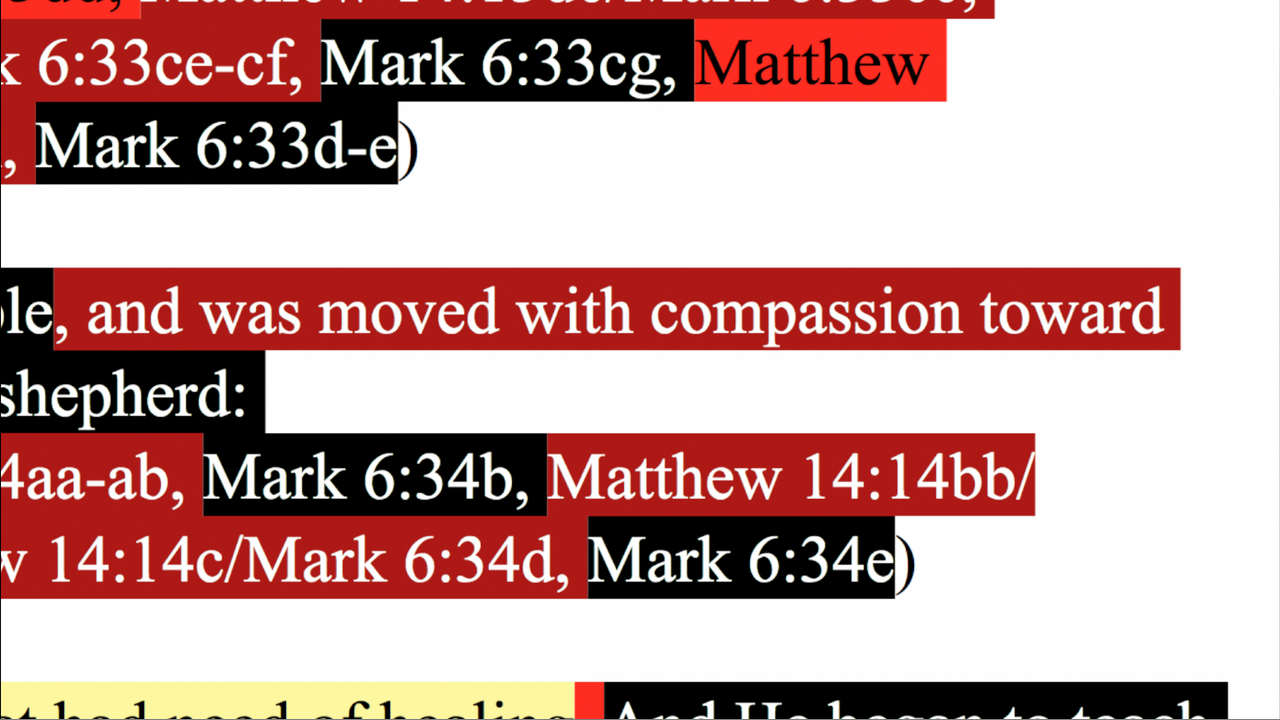 Matthew 14:14, Mark 6:34, Luke 9:11 combined.