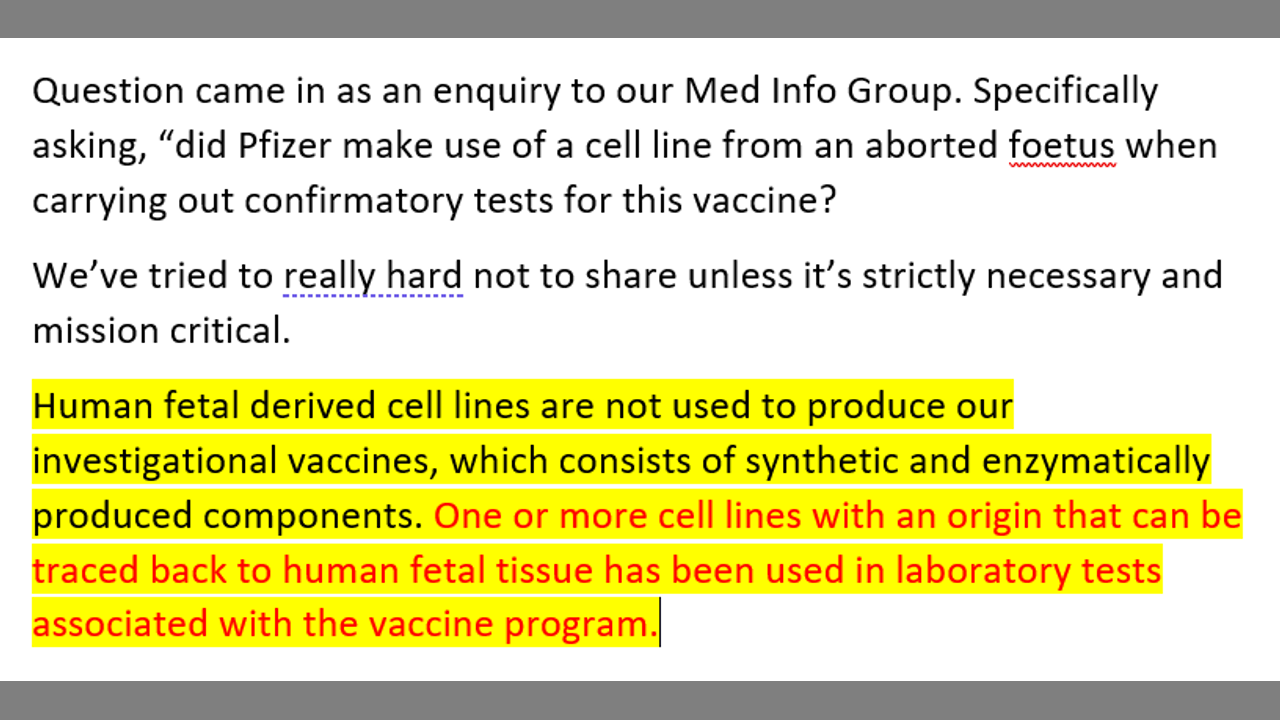 Question came in as an enquiry to our Med Info Group. Specifically asking, “did pfizer make use of a cell line from an aborted foetus when carrying out confirmatory tests for this vaccine?