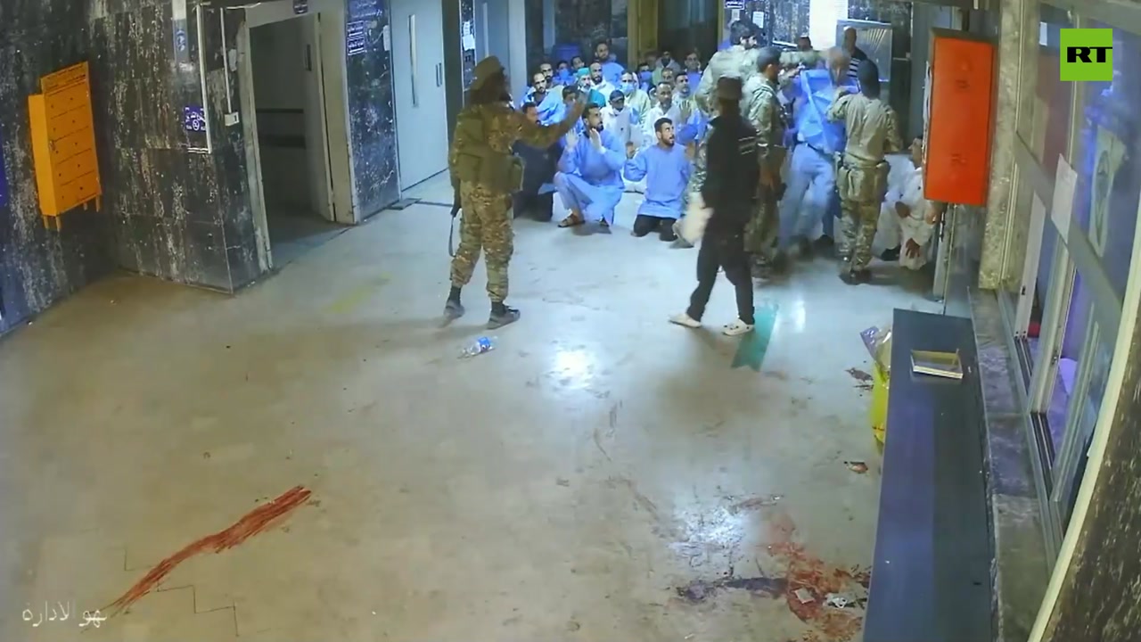 Footage shows large group in hospital uniforms kneeling at gunpoint