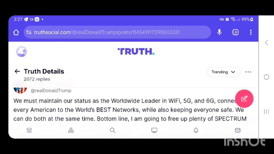 We must maintain our status as the Worldwide Leader in WiFi, 5G, and 6G, connecting every American to the Worldâs BEST Networks, while also keeping everyone safe. We can do both at the same time. Bottom line, I am going to free up plenty of SPECTRUM for auction, so Congress must put 600 MHz in âTHE ONE, BIG, BEAUTIFUL BILL.â Letâs make sure all options are on the table. Never bet against American Ingenuity. MAKE AMERICA GREAT AGAIN! https://truthsocial.com/@realDonaldTrump/114541917095503331