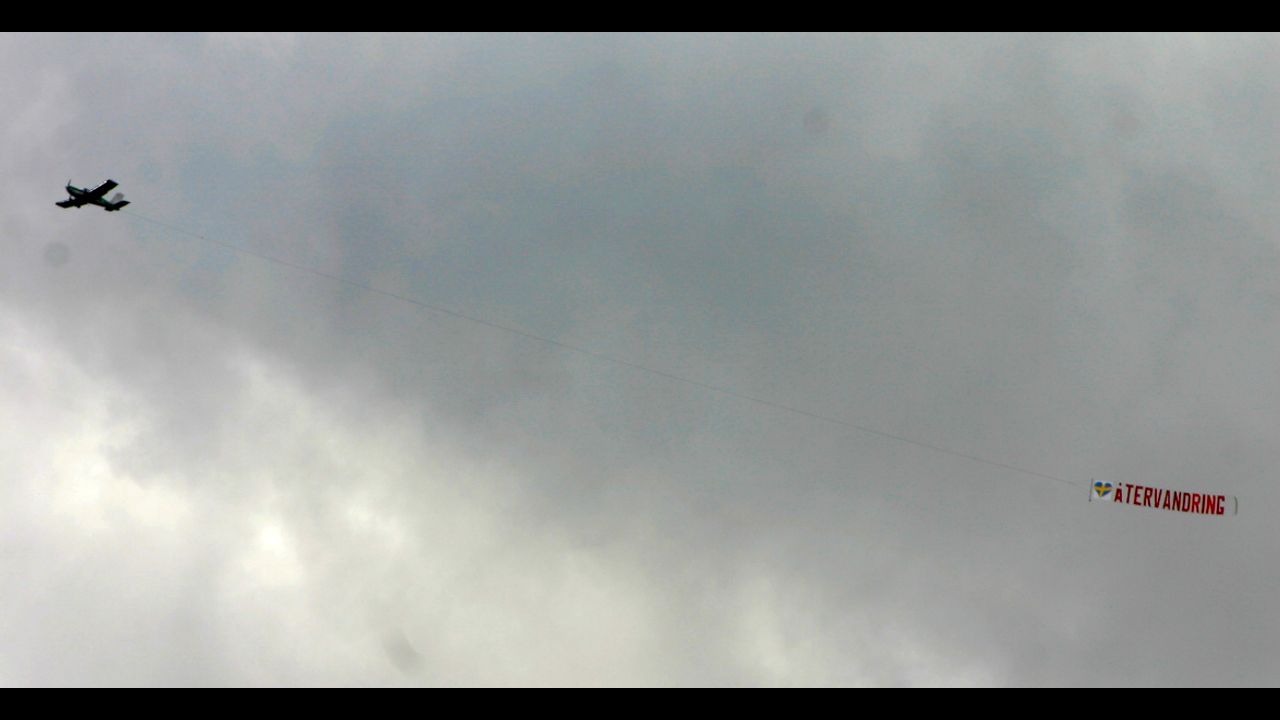 AfS flyger banderollen "återvandring" över Stockholm under Riksdagens öppnande