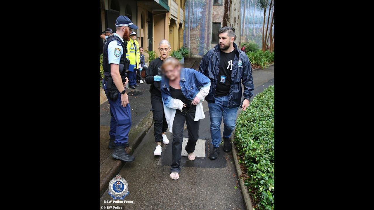Vision from the scene shows police ramming down the couple's door and entering their ramshackle home, with a 72-year-old man limping out of the Surry Hills property with officers.