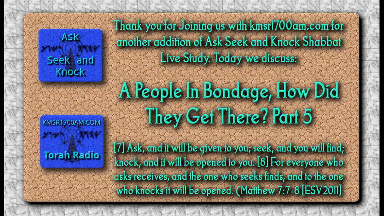 Shabbat Shalom and Thank you for Joining us with kmsr1700am.com for another addition of Ask Seek and Knock Shabbat Live Study. Today we discuss the topic “A People In Bondage. How Did They Get There? Part 5”. Grab your highlighters and your Scriptures and lets get to it.
