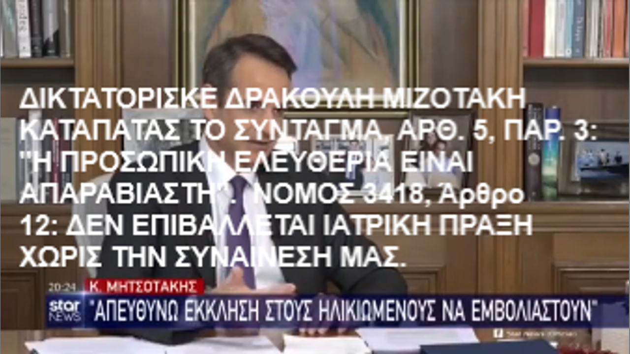 ΔΙΚΤΑΤΟΡΙΣΚΕ ΔΡΑΚΟΥΛΗ ΜΙΖΟΤΑΚΗ ΚΑΤΑΠΑΤΑΣ ΤΟ ΣΥΝΤΑΓΜΑ, ΑΡΘ. 5, ΠΑΡ. 3: "Η ΠΡΟΣΩΠΙΚΗ ΕΛΕΥΘΕΡΙΑ ΕΙΝΑΙ ΑΠΑΡΑΒΙΑΣΤΗ". ΝΟΜΟΣ 3418, Άρθρο 12, ΔΕΝ ΕΠΙΒΑΛΛΕΤΑΙ ΙΑΤΡΙΚΗ ΠΡΑΞΗ ΧΩΡΙΣ ΤΗΝ ΣΥΝΑΙΝΕΣΗ ΜΑΣ https://www.brighteon.com/c22c3b1b-9b25-414c-9e2d-c41d30d92225 , https://ugetube.com/watch/Qvig5npv6v9J14d