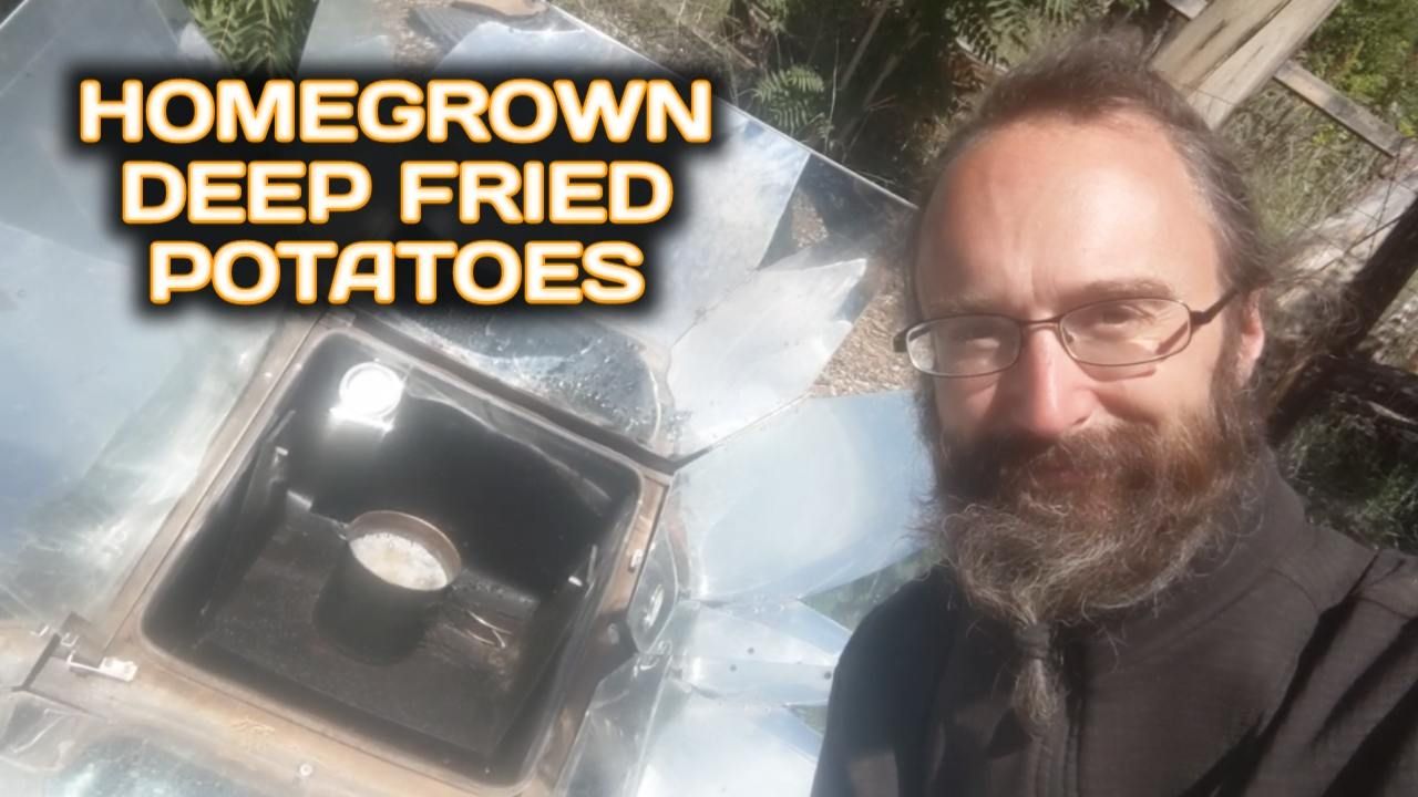 I experiment with deep frying the homegrown potatoes in coconut oil using the offgrid solar oven.