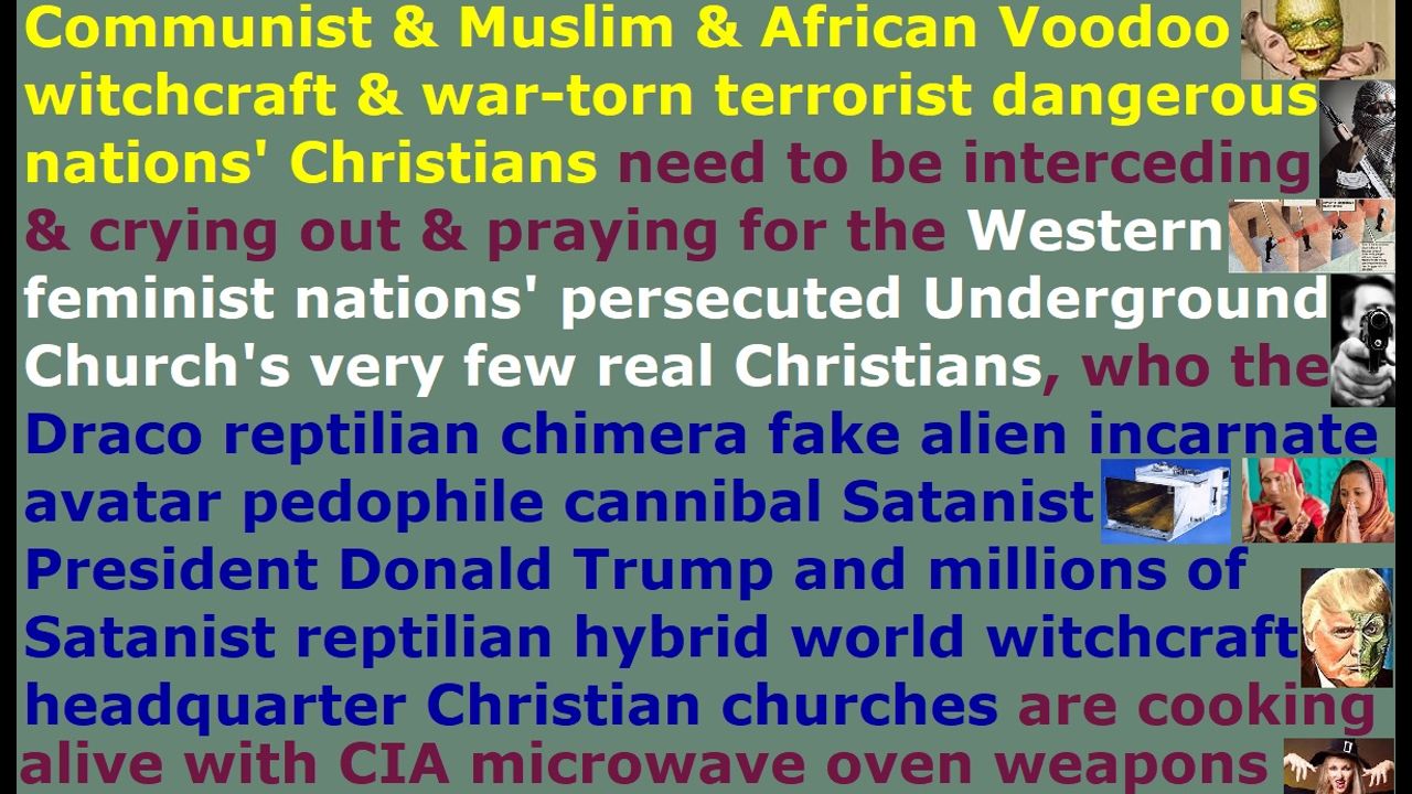 *** Intelligence news update from the Human Homo-Sapiens Race Survival Resistance (HRSR) headquarters and Republic Rebel Alliance battlefront (July 2025). Communist nations & Muslim nations & African Voodoo witchcraft nations & war-torn terrorist dangerous nations' Christians need to be interceding & crying out & praying for the Western feminist nations' persecuted Underground Church's very few real Christians, who the Draco reptilian chimera fake alien incarnate avatar pedophile cannibal Satanist President Donald Trump and millions of world witchcraft headquarter Christian churches are cooking alive with CIA microwave oven weapons and are trying to kill and are persecuting all day long every day 365 days a year, because they are defending the millions & millions of Western feminist nations’ “Bible verses redefining, women’s head coverings rebelling, fallen angel head controlled, men’s pants cross-dressers androgynous transgender God’s-Word-mockers” “Jezebel demon-possessed” post-1960s most wicked generation “2 Timothy 3:2-5” fake Christians and every single pastor, who betrayed them and threw them out to the tens of thousands of Illuminati assassins and abandoned them to fight alone against the millions of assassins & world elites & their militaries & their governments & their space fleets & Draco Empire & fallen angels & Satan Lucifer, in order to protect the millions of fake Christians and their families and the human specie and humanoids and allies and the earth and the women & children. The fake Christians do not expose the tens of thousands of truths that we real Christians shared to them in our daily sermons for decades every day, without sleeping or eating or bathing or marrying or looking for work to cover our own living costs, while receiving assassination attempts, and getting cooked alive by CIA microwave oven weapons from next door homes & every hotel room, and facing starvation & homelessness risks with only a few dollars left in our pockets many a time, and getting ridiculed by all church donators as lunatic heretic idiotic narcotic maniacs, and getting attacked by demon spirits all day long. Instead, they redefine hundreds of Bible verses to replace Jesus with hundreds of fake foreign gods, in order to recruit their 99% religious filth church donators into their fake Christianity to mislead millions of people into hell. They are fake "Bible's watchmen on the wall." Even worse, they even have the audacity to bring greater judgment upon themselves by insulting God by trying to appease both Satan Lucifer & God by modifying & diluting & sterilizing & picking & choosing & editing the tens of thousands of truths we real Christians shared to them in our daily sermons for decades, in order to make it safe for themselves from assassination attempts and ridicule from church donators, so that they can sabotage God’s truths and destroy our real Christians’ ministries and cover-up Satan Lucifer and mislead millions of people to hell & false realities & false understandings & false complacencies & false political/social solutions. The worst sly conniving fake Christians are those who pretend that they do not have the Holy Spirit's discernment of the truth, in order to use that as an excuse to remain silent to condone all the evils. Preach this in your next Sunday church service sermon, so that all your church member witch assassins will try to assassinate you and slaughter your genetic descendant idols, and 99% of your church donators will leave your church in disgust & anger & sheer terror, so that God’s house will be cleansed of their religious filth. Do it now and do not wait until tomorrow, unless you are a crazy lunatic who has lost all common sense of the Holy Spirit.