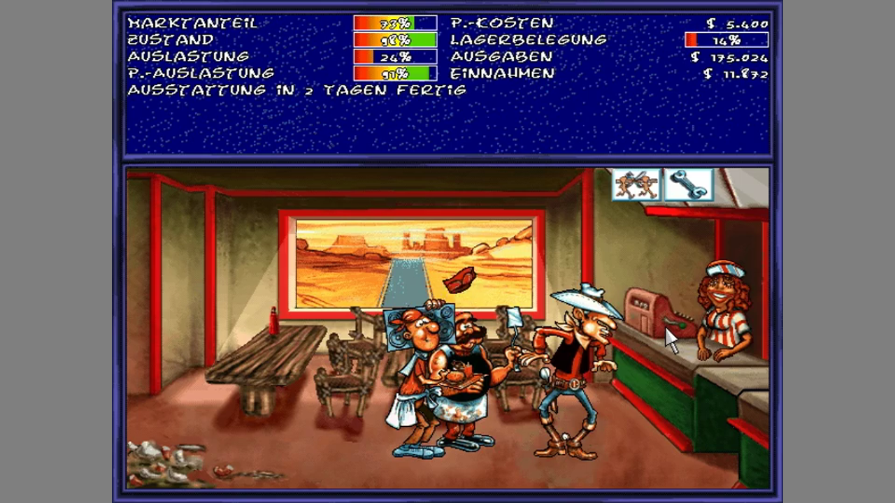 American Dream is a typical German economical simulation in the vein of Mad TV or Pizza Connection. You have a number of static screens where you click on different objects to access menus. You order various kind of fastfood and softdrinks for your restaurant, place ads, hire staff, set prices and renovate, extend and build restaurants. You can buy insurances against accidents, sabotage and things like food poisonings (food you buy has an expiration date). At the beginning of the game, you choose a rival to play against. You can hire people to sabotage your opponents restaurants and vice versa. Restaurants can be protected by hiring private investigators, who will also look after the quality of your food and the state of the restaurant. Once you have become responsible for the whole US, you can hire managers to take care of restaurants in order to cut down the micro-management. Then you can also develop new products in a lab.