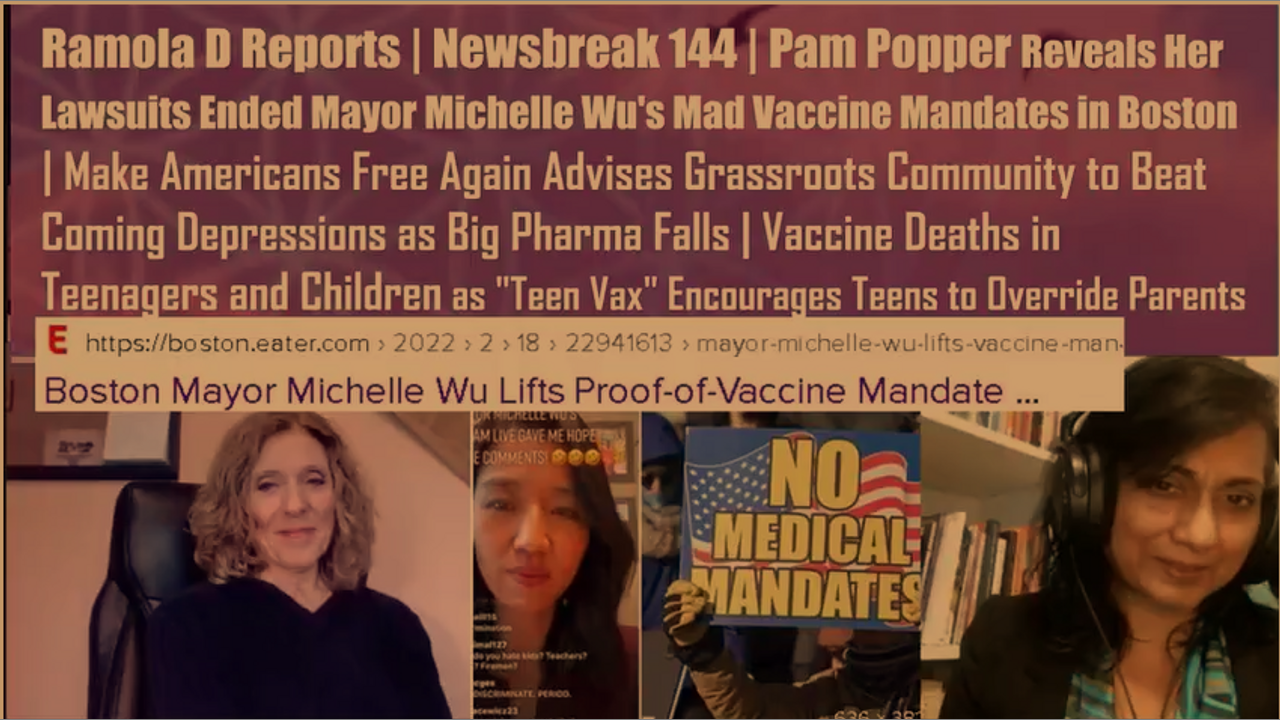 Timely and informative conversation with Pam Popper, President of Wellness Health Forum and Make Americans Free Again, revealing that her organization's personal liability lawsuits against Mayor Wu and her fear-stirring doctors for their unwise vaccine mandates and passports for Boston restaurants led to immediate retraction of the mandates, which occurred last week.
