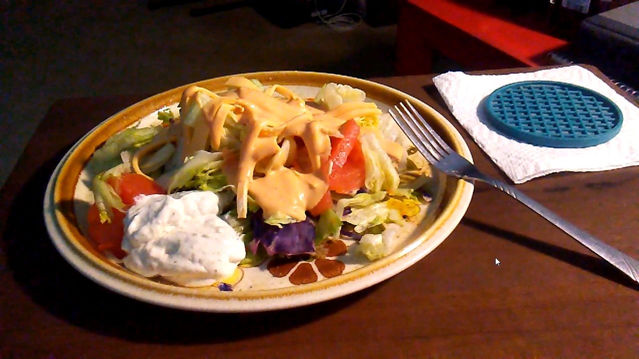 Iceberg salad with beef steak tomatoes, Kraft American cheese, Kraft 100 Island dressing, and Frito Lay ranch dip