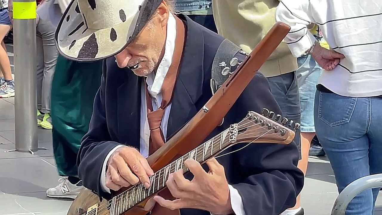 Shoppers stop to admire Mike in Melbourne's Bourke Street Mall. Only skilled buskers are permitted to play in the Mall and Mike easily passed the audition. Watch his fingers dance along the frets creating music magic. Enjoy.