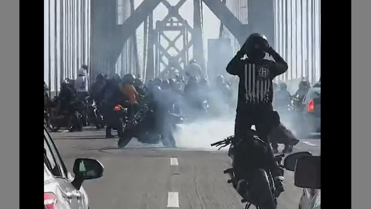 2-wheeled sideshow blocks SF-bound traffic on Bay Bridge Sun afternoon. “About 75-100 bikers swarmed cars from behind, some riding on their back wheels only, then proceeded to arrange in a solid line across all lanes before slowing down & stopping altogether,” witness tells.The bikers could be seen performing donuts with smoke from the burnt rubber filling the air.