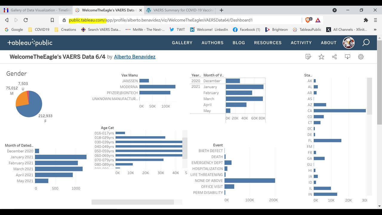 For those in the know, you know I am collaborating with some heavy hitters and there will be more analytics people coming on to authenticate this data for what it is. It's being throttled, it's been deleted and it's been compromised. The idea of a free online interactive tool could and should be used to easily see VAERS data for one's self. Now you can have FREE online interactive research capabilities to give you and your loved ones FULL INFORMED CONSENT. I will be improving my dashboard regularly. All's you need to do is go onto Tableau Public and search the word WelcomeTheEagle (free sign-in with Tableau may or may not be required).