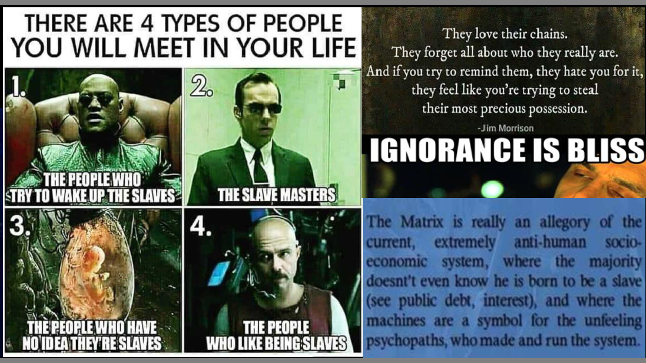 MORPHEUS: "That you are a slave, Neo. Like everyone else, you were born into bondage, born into a prison that you can not smell or taste or touch. A prison for your mind. Unfortunately, no one can be told what the Matrix is. You have to see it for yourself."