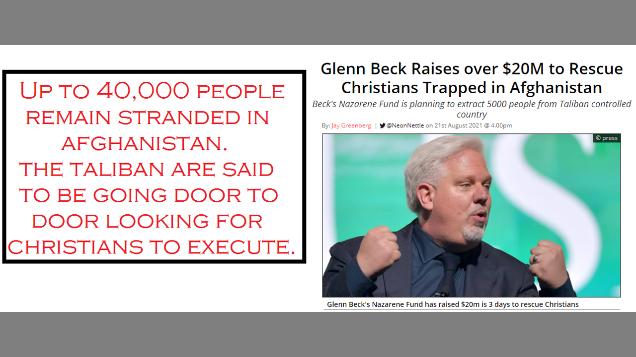Up to 40,000 of our fellow Americans are still stranded in Afghanistan. Looks like Biden & Co. have left them high & dry. But it also looks like Glenn Becj has stepped up to fill the gap. Please join me in creating a prayer chain for our brothers & sisters!