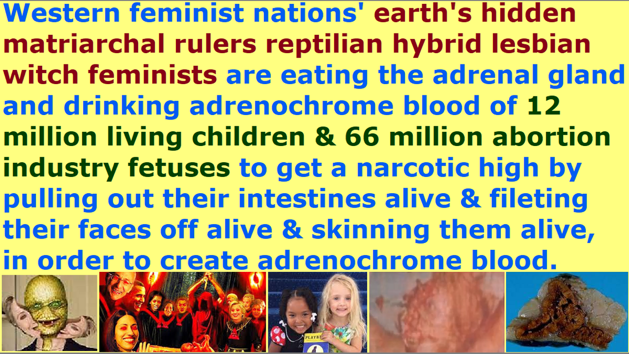 *** Intelligence news update from the Human Homo-Sapiens Race Survival Resistance (HRSR) headquarters and Republic Rebel Alliance battlefront (March 2023). The earth’s hidden matriarchal rulers New Age Wicca witch pedophile cannibal Satanist Pedogate Pizzagate “White House Pizza Night” orgy child sex magick ritual LGBTPB (lesbian gay bisexual transvestite pedophile bestiality) reptilian hybrid feminists and “gay mafia elite” bisexual Draco reptilian chimera fake aliens incarnate avatar globalist elites are eating the Planned Parenthood company’s 66 million abortion fetus sales industry’s babies and 12 million living children’s adrenal glands and pineal glands ever year as a form of narcotics. They torture the child, in order to fill the blood with adrenalin, in order to create adrenochrome blood, which gives them a narcotic high also, and keeps them young, and helps them maintain a 50% human and 50% Draco DNA genes balance so that they can shapeshift back and forth using child sacrifice Satanist vampire rituals. They torture the children by skinning their faces off by fileting them alive, and gauging out their eyes alive, and pulling out their intestines alive, and eating their limbs alive, and using forceps through their noses to pull out their pineal gland and pituitary gland alive to eat, and cutting out their adrenal gland that contains the adrenalin narcotic to eat from the living children, and cut their juggler neck artery to drink their adrenochrome blood alive while the child is still fresh and scared. They prefer children from 1 year old to before puberty, because they still do not have so much of their earth’s hidden matriarchal rulers reptilian hybrids and Draco reptilian chimera fake aliens incarnate avatar black nobility families and Pleiadian Watcher fake aliens fallen angel incarnate avatar globalist elites’ toxins that they poison the humans using chemtrail pesticides and tap water fluoride and supermarket food toxins and pharmaceutical industry poisoning and hundreds of other ways they exterminate the humans. They kill off entire civilizations from the earth like the Tartaria civilization in the 1800s which had more advanced technology than modern technology, and they rewrite history, and restart earth’s civilization with massive amounts of mind-programmed little orphan pedophile child sex slaves. This is why in reality, the original real France and Britain and Spain were located in North America, which had very highly advanced technology Tartarian civilization cities which they demolished to erase all the technology and free energy and spaceship levitation technology, and created a fake France and Britain and Spain in Europe. Satan Lucifer’s “ordained & allowed & trained & non-assassination-attempt-receiving” fake unbiblical job position pastors and religious Christian hordes are hiding all of this, because of the fear of assassination attempts by all their church witch members and Satanist pastors, and ridicule from their church donators as lunatic heretic idiotic narcotic maniacs. They are kept safe by Satan Lucifer in his millions of churches, in order to hide the truth, and kick out real Christians who speak the truth or the original Bible verses, and to redefine hundreds of Bible verses to replace Jesus with a fake Sananda Jesus and Jezebel and Mammon and Adephagia and hundreds of other fake foreign gods, and removal of God’s spiritual protection, so that they can bring back millions of fallen angel devils from the abyss to take over the society and replace 33.3% of the Western feminist nations’ population and 70% of the Western feminist nations’ military & police, which the pastors and religious Christian hordes are hiding from the church donators and 6 billion humans. The blood of all their church donators and 6 billion humans will be on the hands of these fake “Bible’s watchmen on the wall.”