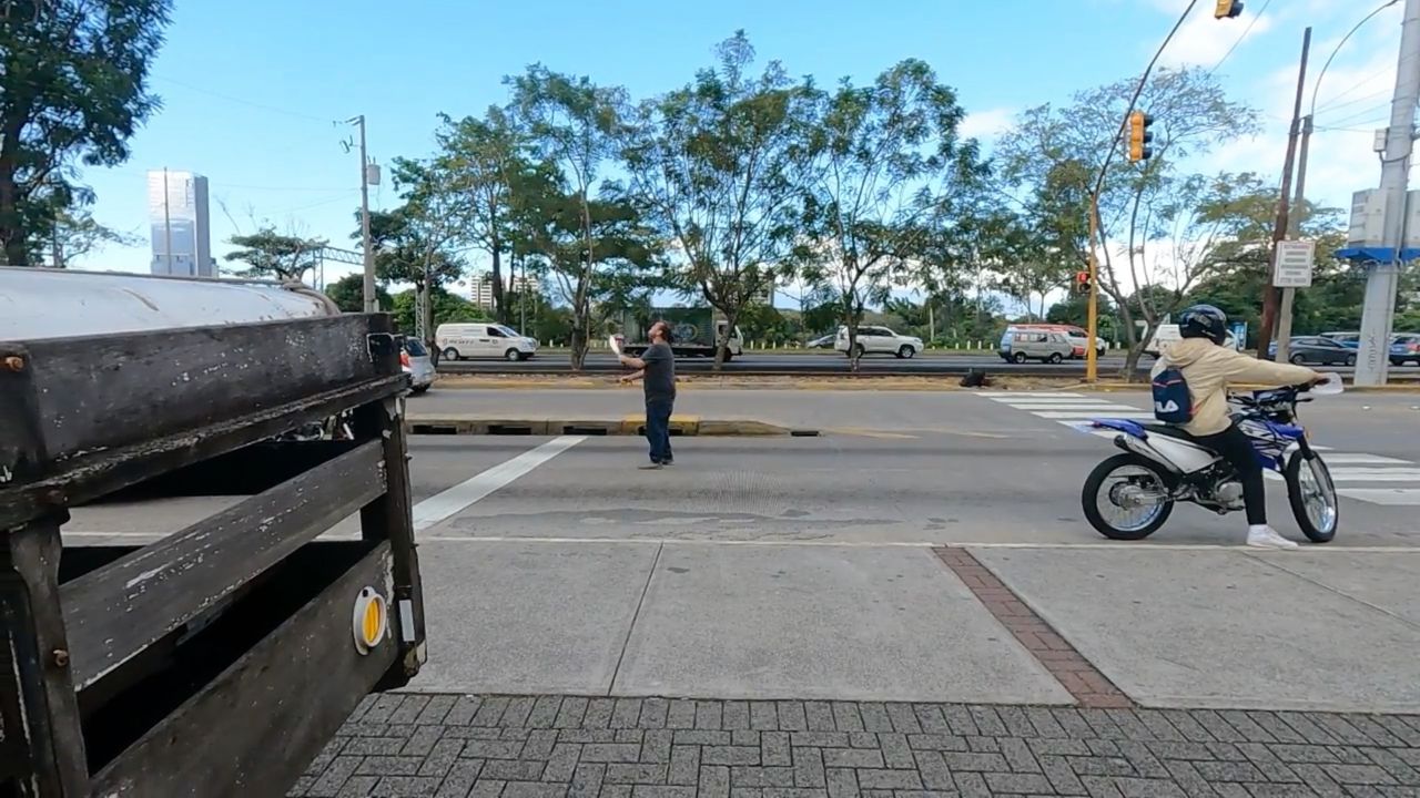 A lot of people didn’t understand what this guy was doing. He is an INTERSECTION ENTERTAINER, JUGGLING MACHETES FOR TIPS.