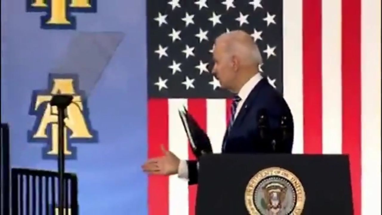 CONFUSED--- AFTER BIDEN FINISHED HIS SPEECH, HE TURNED AROUND & TRIED TO SHAKE HANDS WITH THE AIR!
