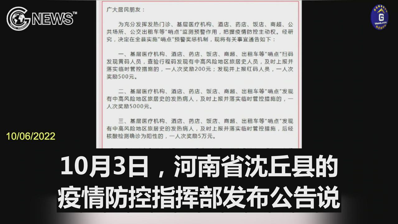 10/06/2022 According to the announcement by the COVID Prevention and Control headquarters of Shenqiu County, Henan Province, checkpoint personnel can get high reward for reporting red and yellow codes