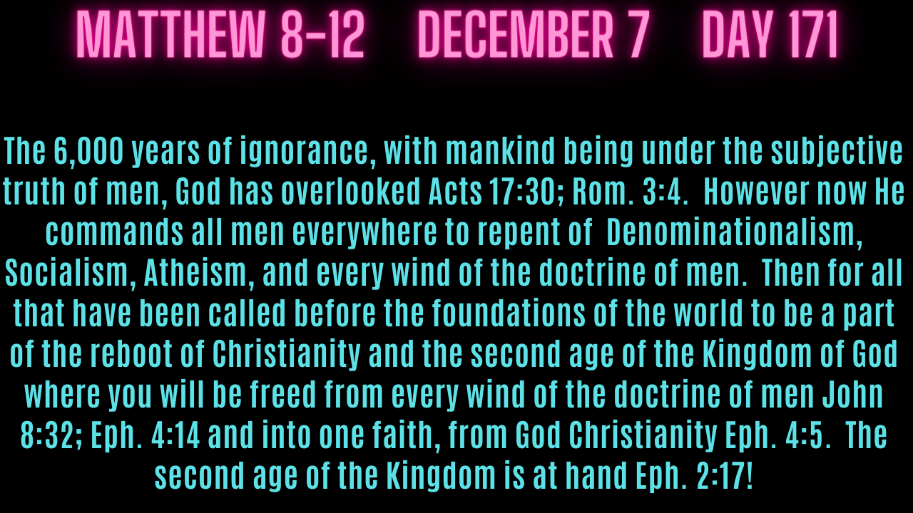 The 6,000 years of ignorance, with mankind being under the subjective truth of men, God has overlooked Acts 17:30; Rom. 3:4. However now He commands all men everywhere to repent of Denominationalism, Socialism, Atheism, and every wind of the doctrine of men. Then for all that have been called before the foundations of the world to be a part of the reboot of Christianity and the second age of the Kingdom of God where you will be freed from every wind of the doctrine of men John 8:32; Eph. 4:14 and into one faith, from God Christianity Eph. 4:5. The second age of the Kingdom is at hand Eph. 2:17!