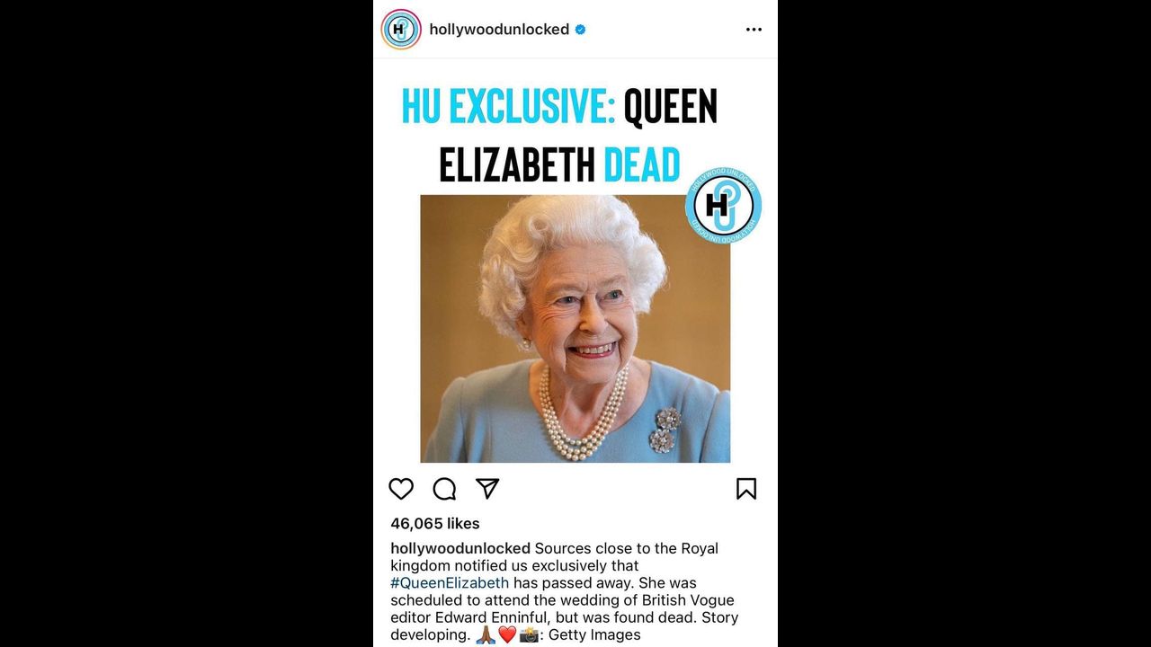 🚨 ‘Hollywood Unlocked’ a verified page with 2.8 million followers on Instagram is spreading rumors that Queen Elizabeth II is dead.