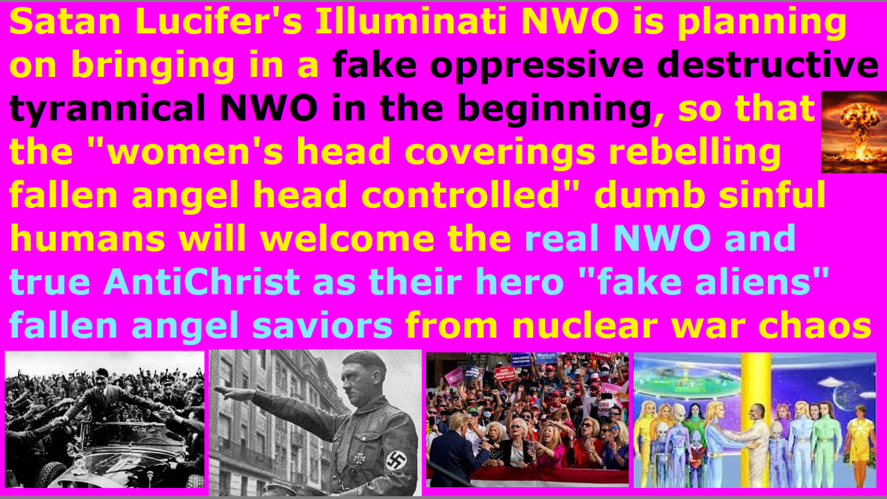 *** Intelligence news update from the Human Homo-Sapiens Race Survival Resistance (HRSR) headquarters and Republic Rebel Alliance battlefront (April 2022). The Bible says that, “They perish because they refused to love the truth and so be saved. For this reason God sends them a powerful delusion so that they will believe the lie and so that all will be condemned who have not believed the truth but have delighted in wickedness.” They are planning to bring in a fake oppressive destructive tyrannical NWO in the beginning, so that they can bring in their real NWO and true AntiChrist (fake Jesus’ Second-Coming “Post Pan Pre-Wrath Tribulation Rapture Theories lies AntiChrist fake millennial kingdom of Christ”) prepper Christian ministry business people’s god and fallen angel devils “fake good aliens” fake heroes to the earth to save the dumb sinful human populace, who are redefining Bible verses and rebelling against women’s head coverings so that their heads are controlled by the fallen angels, and deceive them into welcoming the real NWO and true AntiChrist and the devil as their heroes and saviors and fake messiah and gods. Looking at how these Western feminist nations’ End Times apostate harlot Church’s “women’s head coverings rebelling fallen angel head controlled” religious Christians and “women’s equality” pastors are deceived into worshipping Donald Trump and Jezebel and Sananda Jesus and Mammon and Satan Lucifer’s pre-1941 “The Plan’s” Bible prophecy rapture billion dollar industry’s pedophile cannibal Satanist pastors and Mickey Mouse and the pedophile cannibal Satanist Draco reptilian chimera alien incarnate avatar Katy Perry, they will immediately worship the AntiChrist and NWO and devil, too. They despise and hate and scorn us real Christians, because we preach the original Bible verses which the pastors redefined to get church donator and female church donators. Every single pastor and millions of Western feminist nations’ “women’s rights” religious Christians (except for one Christian brother) betrayed us real Christians, and they all threw us real Christians out to the Illuminati wolves, and abandoned us to fight alone against the Illuminati CIA NSA MI6 FBI, and the world rulers, and their black nobility families Draco reptilian chimera alien incarnate avatar bosses, and the Draco Empire space fleet, and the earth’s hidden matriarchal rulers New Age Wicca witch mother goddess cult pedophile cannibal Satanist feminists who are torturing & lesbian raping & sacrificing & eating 12 million children every year, in order to protect them and their families and our human specie and humanoid species and our allies and the earth and the women & children, without sleeping or eating or bathing or looking for work to cover our own living costs or marrying, while we get persecuted horrifically and cooked alive by CIA microwave oven weapons every day from next door homes and rooms. They are a disgrace to God’s name and honor. Stay away from these cowardly traitors, dear brethren, because they will get judged by God’s sword & famine & plague & demon armies, and they will blame God for abandoning and betraying them. They are hypocrites. They abandon and betray God and his real Christians, in order to protect their own selves from assassinations and ridicule by church donators, and they worship the “women’s head coverings rebelling” Jezebel demon, but they will accuse God of abandoning and betraying them when God’s judgment wrath falls upon them. They are Sananda Jesus’ “fake Christianity love & light” hypocrites.